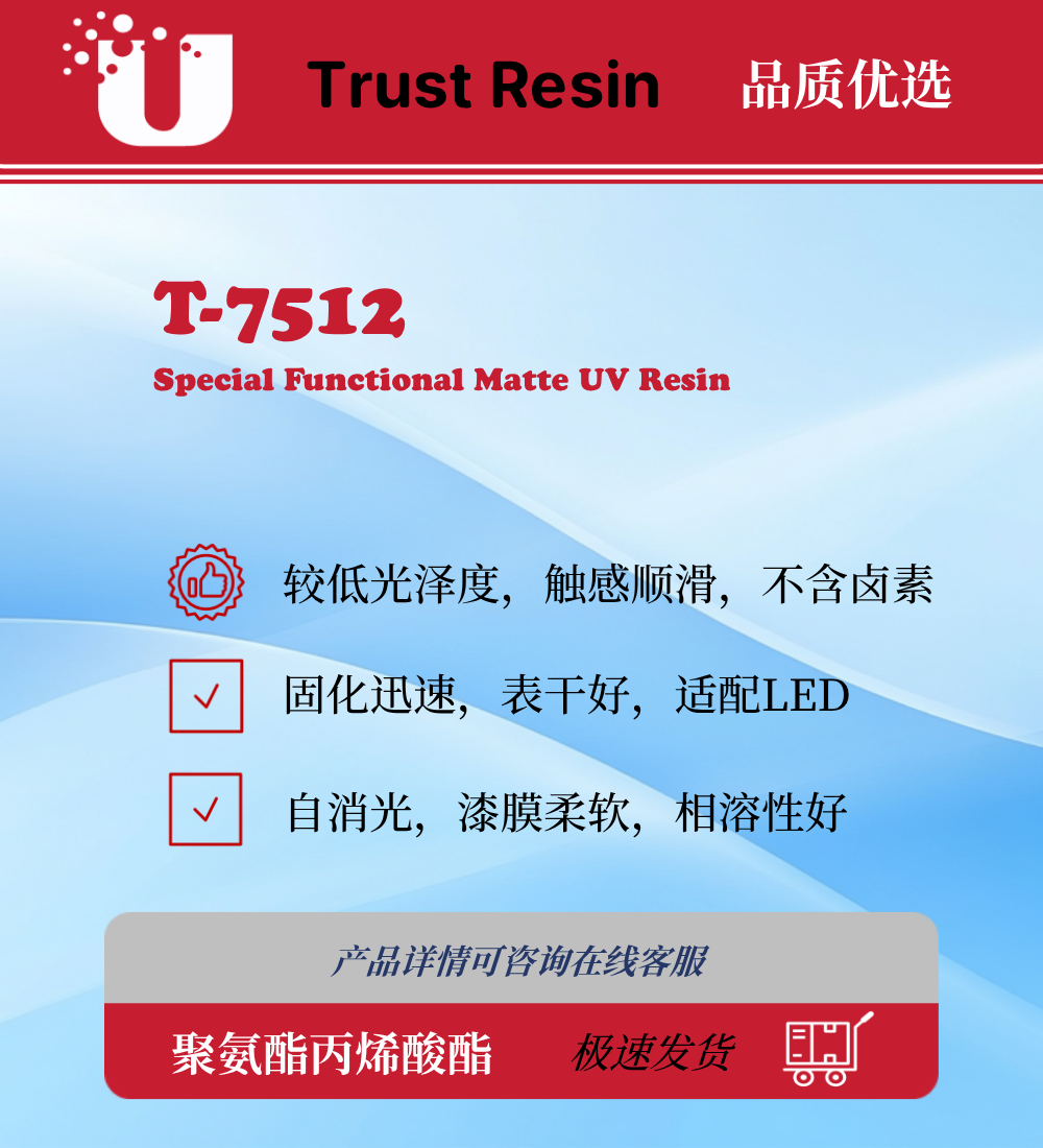 T-7512树脂是一款两官能度功能性自消光聚氨酯丙烯酸酯 UV 树脂,具有较低的光泽度(60°角测试≈30°)光泽均匀、触感顺滑。固化迅速,表干好,低气味,适应于 LED低能量固化。对纸张、薄膜、木器、塑料等有很好的附着能力,漆膜柔软,提高抗刮伤,提高耐酒精性能,不含卤素,可与各类树脂很好的相溶。