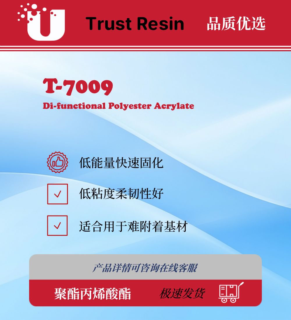 T-7009树脂是一款两官能度聚氨酯丙烯酸酯UV树脂,具有低能量快速固化、低粘度柔韧性好等特点,适用于难附着材料的广泛应用。该树脂在UV涂料、薄膜UV印刷、UV油墨等领域表现优异。