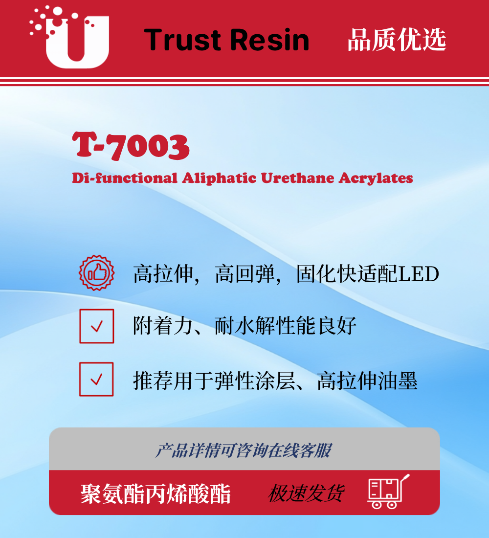T-7003树脂是一款非常特殊的聚氨酯丙烯酸酯树脂,具有非常高的干膜拉伸率(>400%)。固化速度快低能量LED表干好。拥有较好的内聚力,拉伸后可快速回复。拥有较好的附着力及耐水解性。用在UV弹性手感涂层,UV弹性密封圈成型,光固化IMD油墨,复杂弹性3D打印成型,耐低温胶黏剂等领域。
