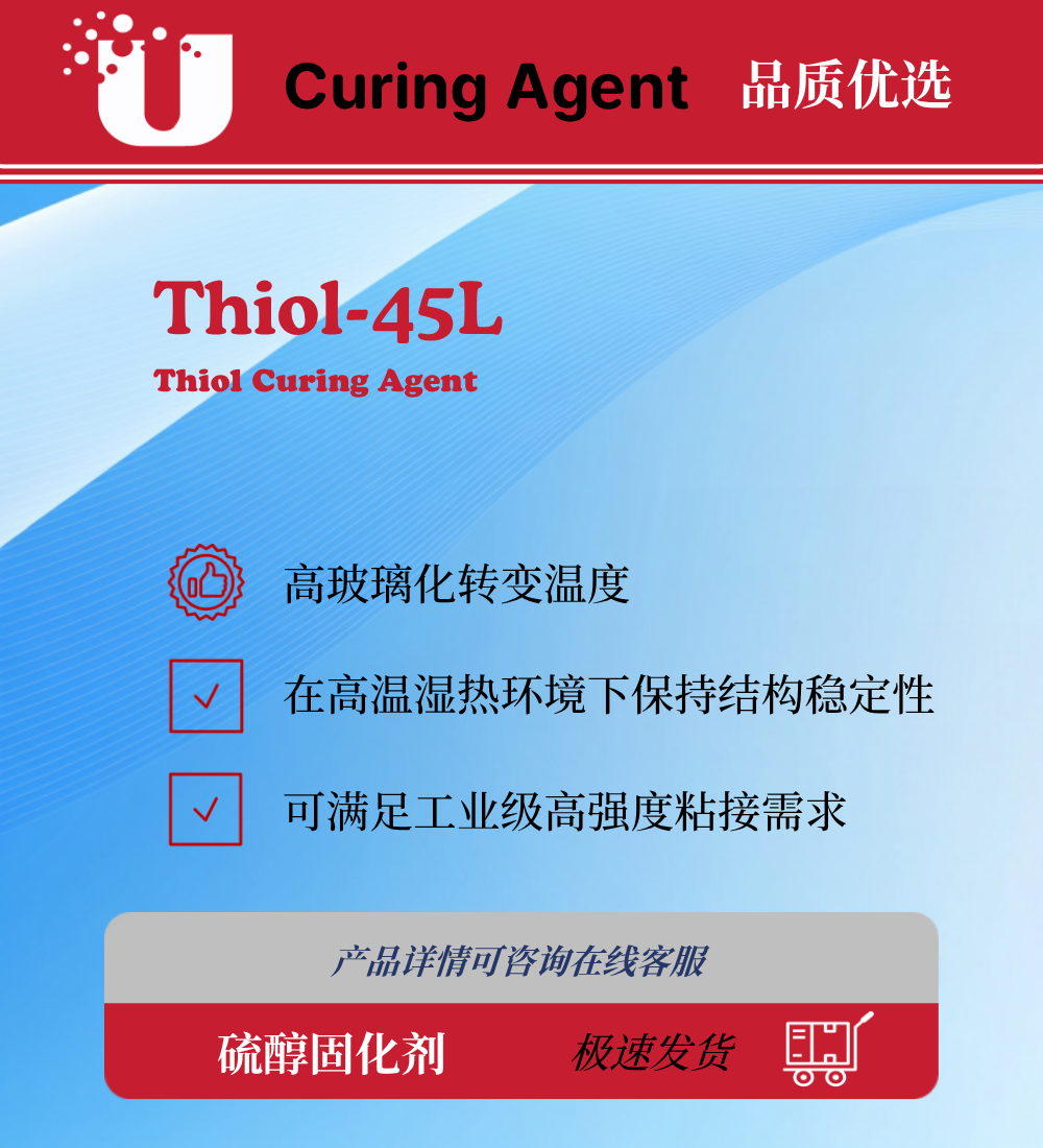 Thiol-45L(六(3-氨基丁酸)双季戊四醇酯),分子量620为系列最高,Tg达42℃,粘度420 mPa·s,有效含量99.8%。其高Tg特性确保在高温或湿热环境下仍保持结构稳定性,减少涂层开裂风险,适用于汽车电子胶黏剂或户外耐候涂料。配合叔胺促进剂可加速环氧树脂固化,显著提升抗张强度与耐磨性,满足工业级高强度粘接需求。