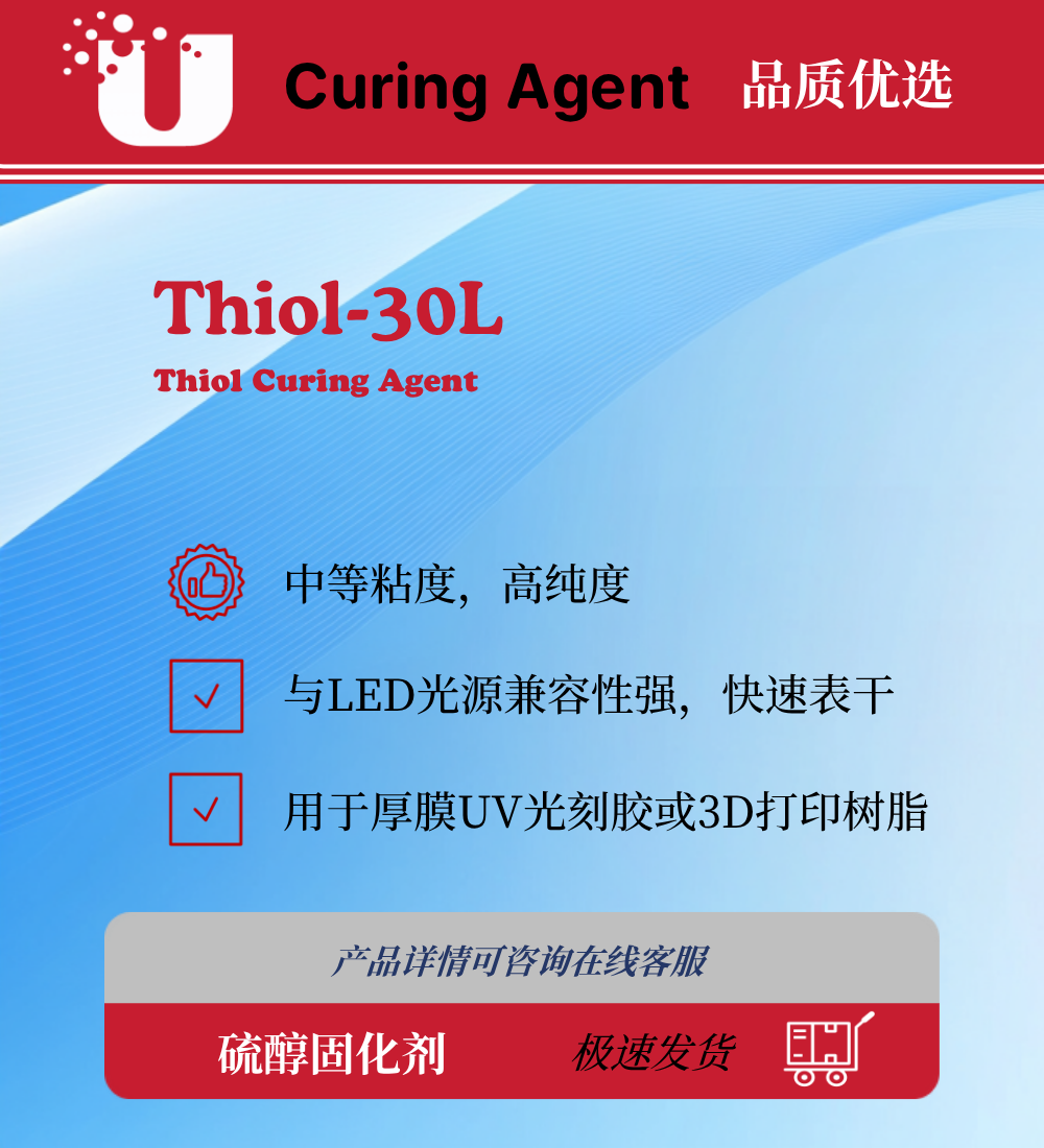 Thiol-30L(四(3-氨基丁酸)季戊四醇酯)分子量545,Tg为-20℃,25℃下粘度为50 mPa·s,有效含量达99.5%。其中等粘度和高纯度特性使其适用于厚膜UV光刻胶或3D打印树脂,与LED光源(365nm/415nm)兼容性强,可实现快速表干。在环氧体系中,其耐湿热性和机械性能表现突出,尤其适合电子封装胶及高精度印刷油墨,兼顾生产效率与涂层可靠性。