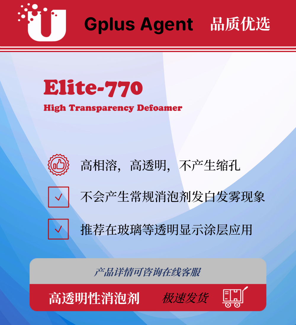大分子量丙烯酸酯聚合物,高相溶性,不产生缩孔不影响层间附着,高透明性,不会产生常规消泡剂发白发雾现象,适合任意阶段添加。快速消泡及持久抑泡,特别针对聚酯、聚氨酯体系反应性气泡产生有明显抑制作用。特别推荐在玻璃、亚克力、PC 等透明显示涂层应用。