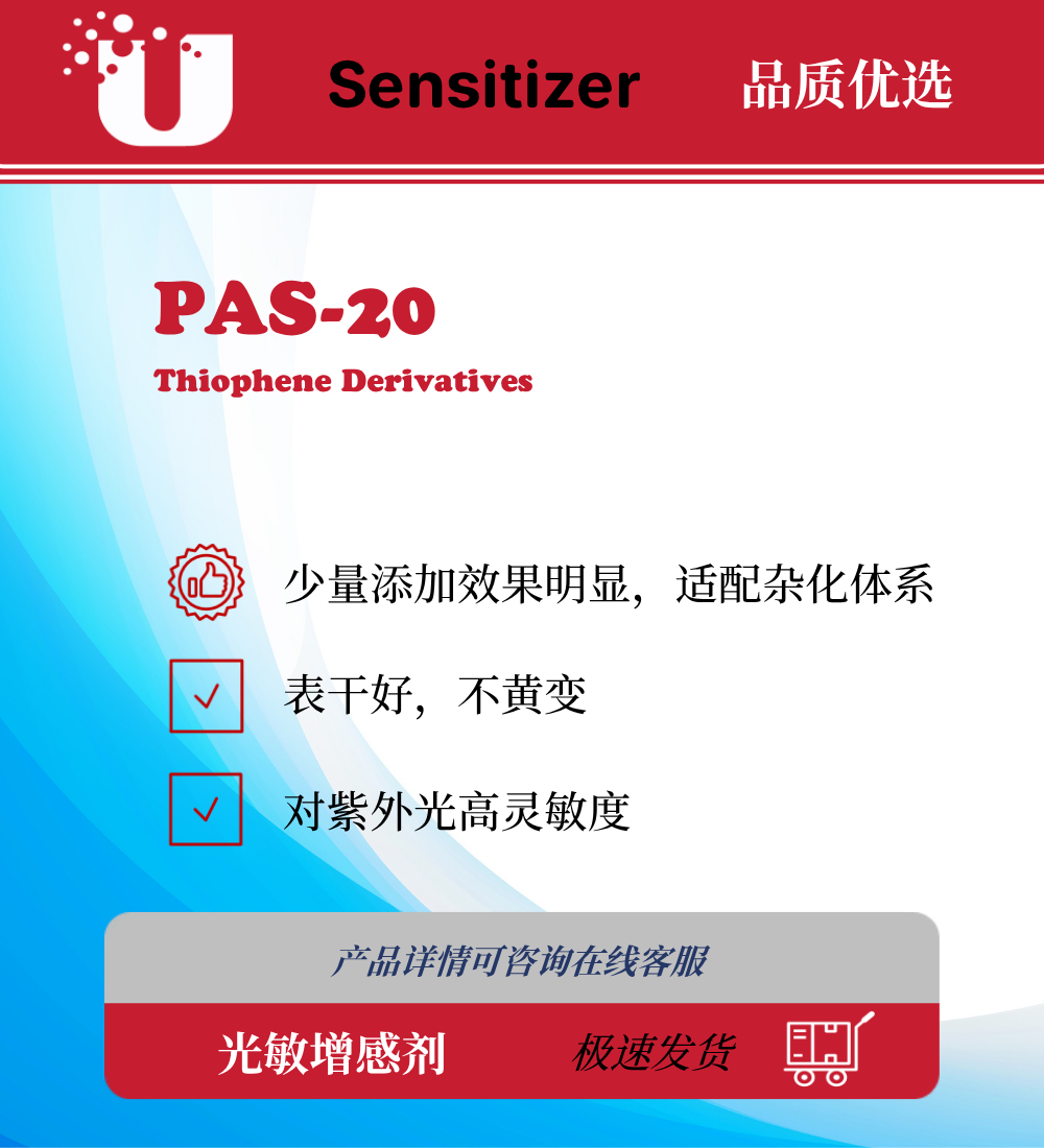 PAS-20 是一款噻吩结构的衍生物,对紫外光有非常高的灵敏性,1‰的添加量即能起到明显作用。对阳离子和自由基体系光引发剂都能起到增感作用。表面干燥性好,不会引起黄变。建议先配置成10%浓度的溶液再进行添加使用。