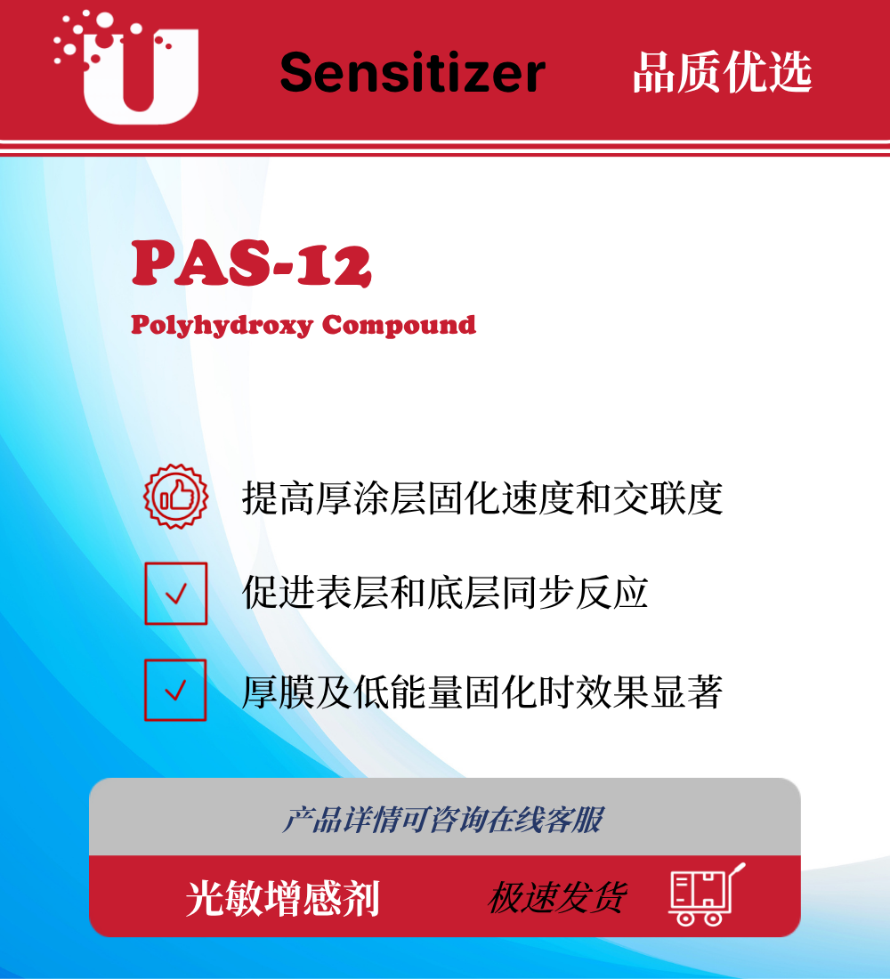适用于阳离子固化体系在单一涂层厚度超过 100μm 时通过添加 PAS-12 羟基多元醇化合物可促进环氧基的开环反应,明显提高固化速率及交联程度。使涂膜表层和底层同步反应,在厚膜及低辐射能量条件下达到快速固化的作用尤其显著。