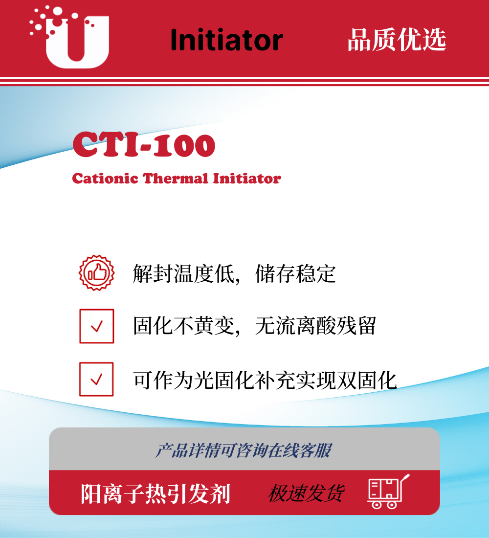 CTI-100 是一款封闭型硫鎓锑酸盐阳离子引发剂,解封温度低,针对环氧化合物的固化反应活性高,但储存稳定性优异。特别应用于脂环族环氧,氧杂环丁烷等不适应胺类固化剂的体系。或作为光固化引发剂的有效补充,在不见光条件或者特厚涂膜作为双固化应用。在电子封装及 3D 打印,环氧复合成型等行业作为后固化反应的交联剂使主体树脂的最终固化更加充分,固化膜不黄变,无游离酸残留。