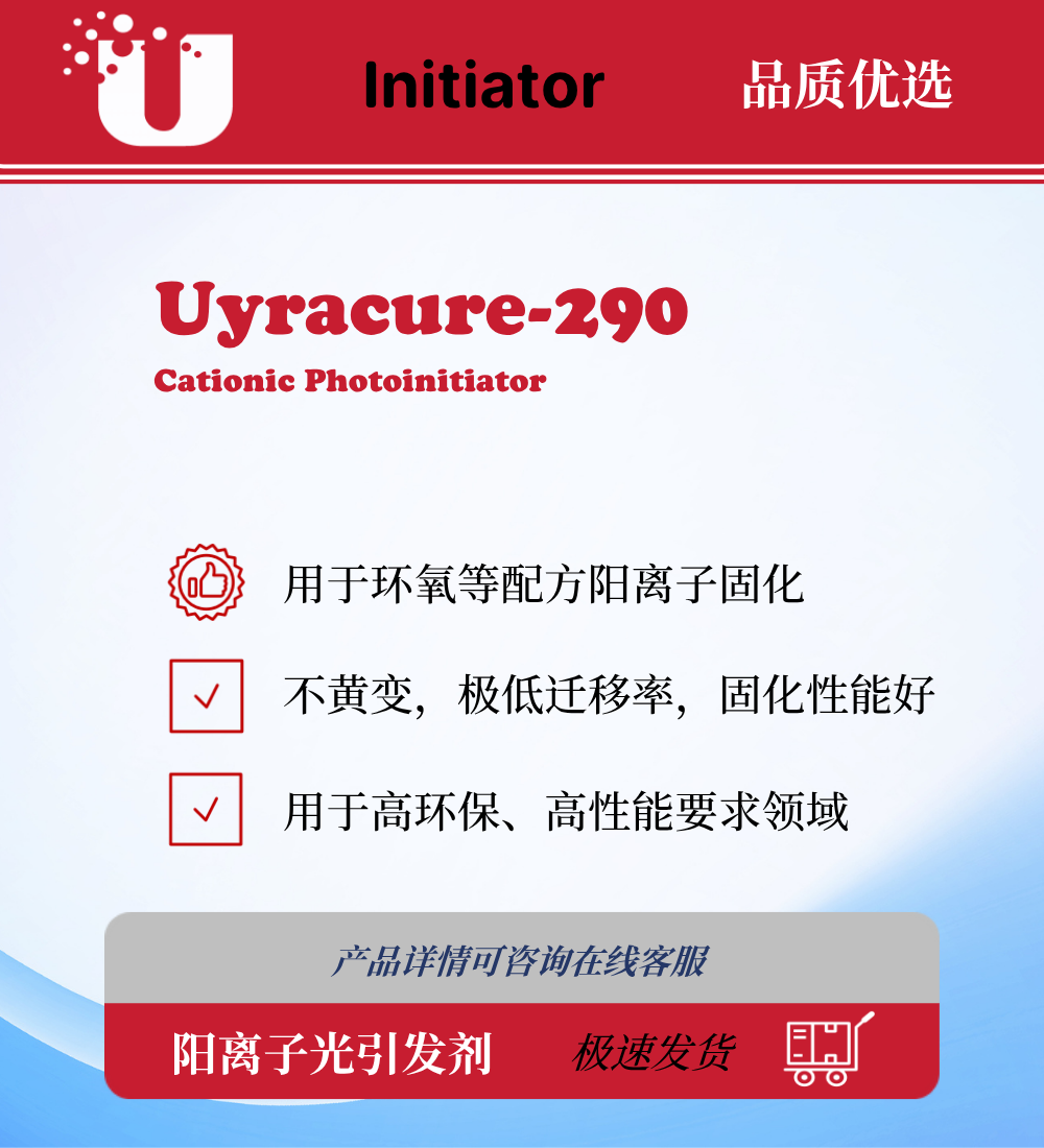 Uyracure-290 是一种新型的阳离子碘鎓盐光引发剂,可用于环氧、氧杂环丁烷和乙烯基醚配方的阳离子固化。具有优异的非黄变性、迁移率极低、固化后无苯释放且固化性能优异等特点,二芳基碘鎓盐光解可同时发生均裂和异裂,既产生超强酸,又产生活性自由基。因此碘鎓盐除可引发阳离子光聚合外,还可同时引发自由基聚合。非常适用于高环保要求,高性能的阳离子固化清漆和有色体系。