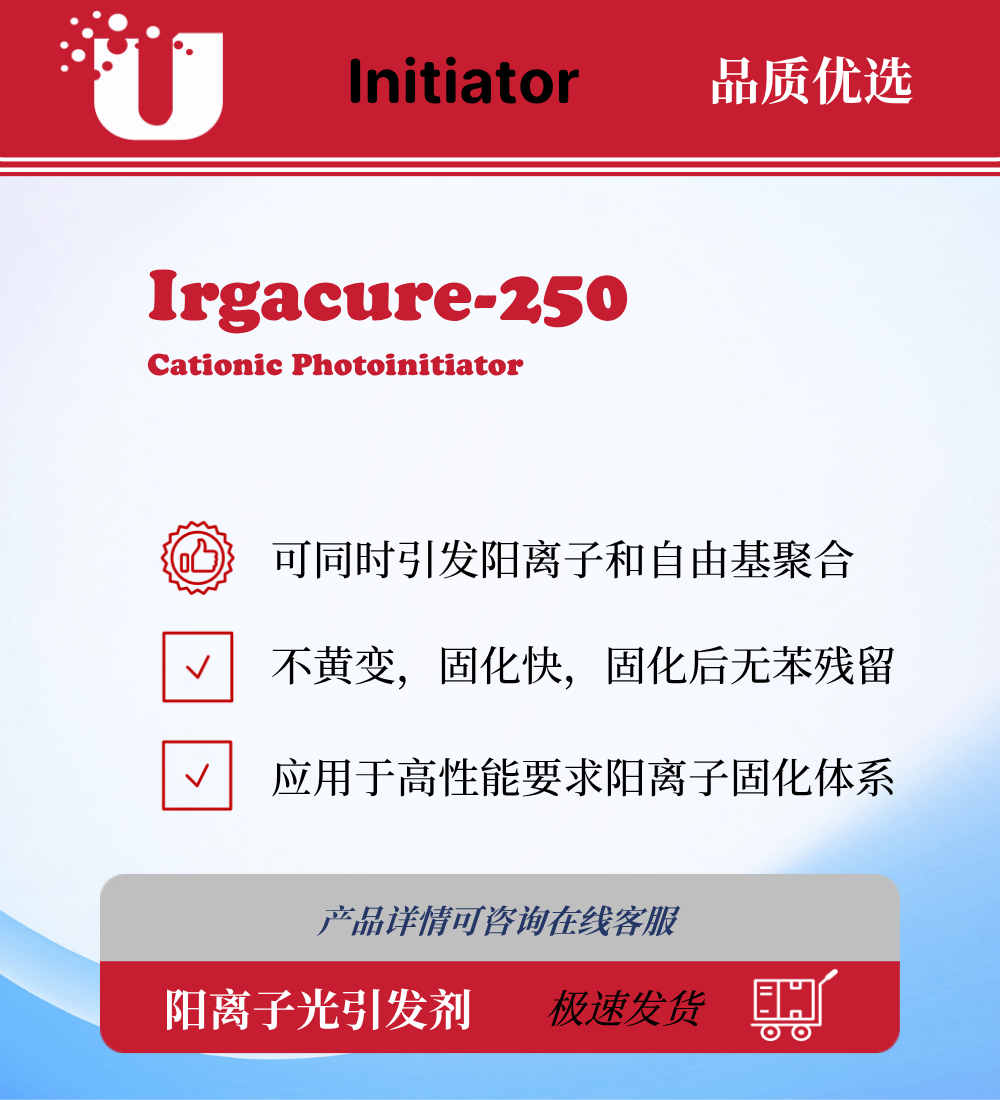 碘鎓盐光引发剂光解可同时发生均裂和异裂,既产生超强酸,又产生活性自由基。因此碘鎓盐除可引发阳离子光聚合外,还可同时引发自由基聚合。具有优异的非黄变性、固化后无苯释放且固化性能优异等特点。Irgacue 250 可单独使用或者与适当的光敏剂混合用于 UV 固化油墨,胶粘剂,图形艺术成像,光刻胶,纸张、金属和塑料表面的清漆。非常适用于高环保要求,高性能的阳离子固化清漆和有色体系。