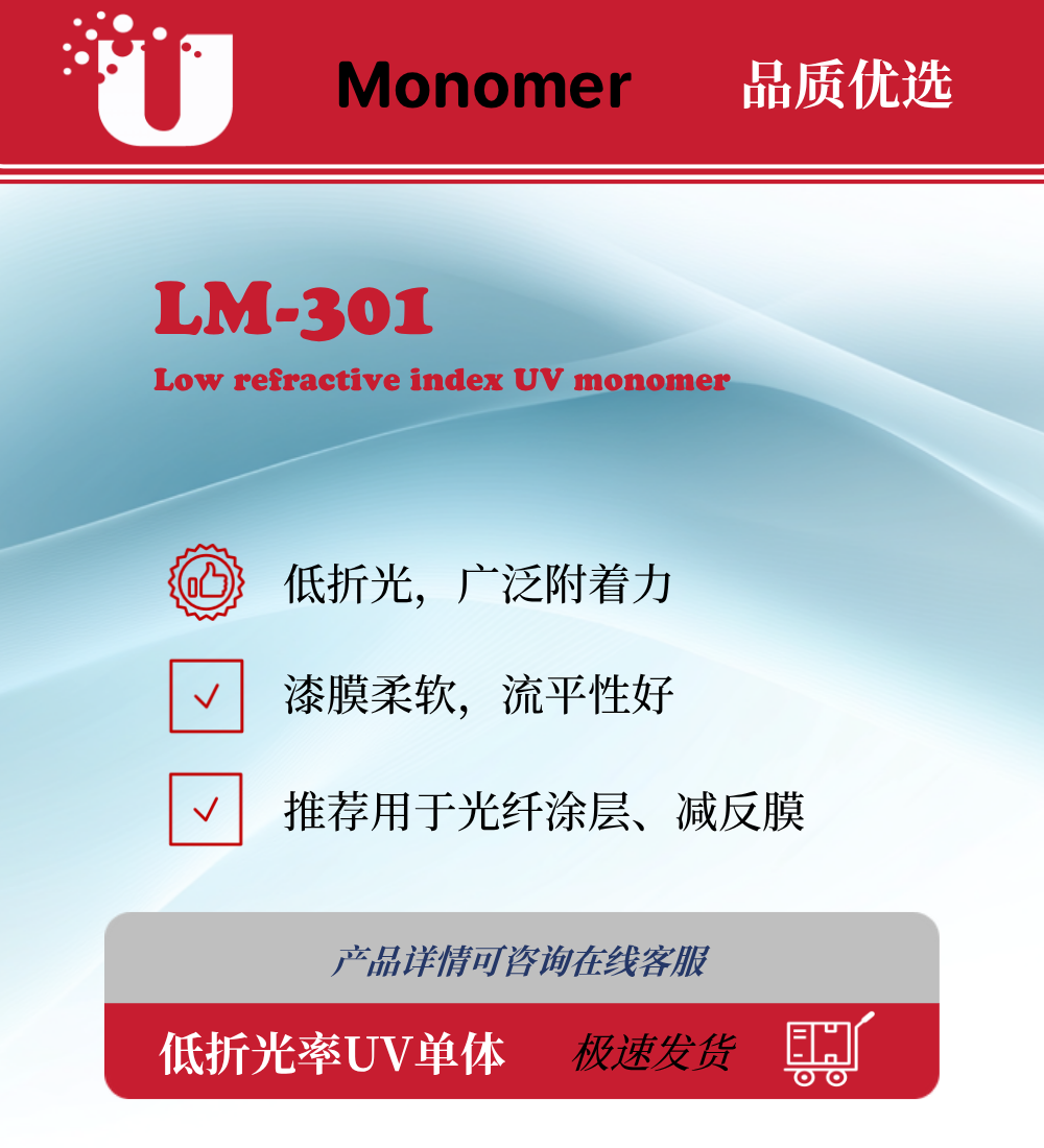 LM-301是单官能度UV单体,具有高低光性、各类基材都有很好的附着性、低粘度。应用于各类光纤涂层、减反膜,润湿流平性好,漆膜柔软。