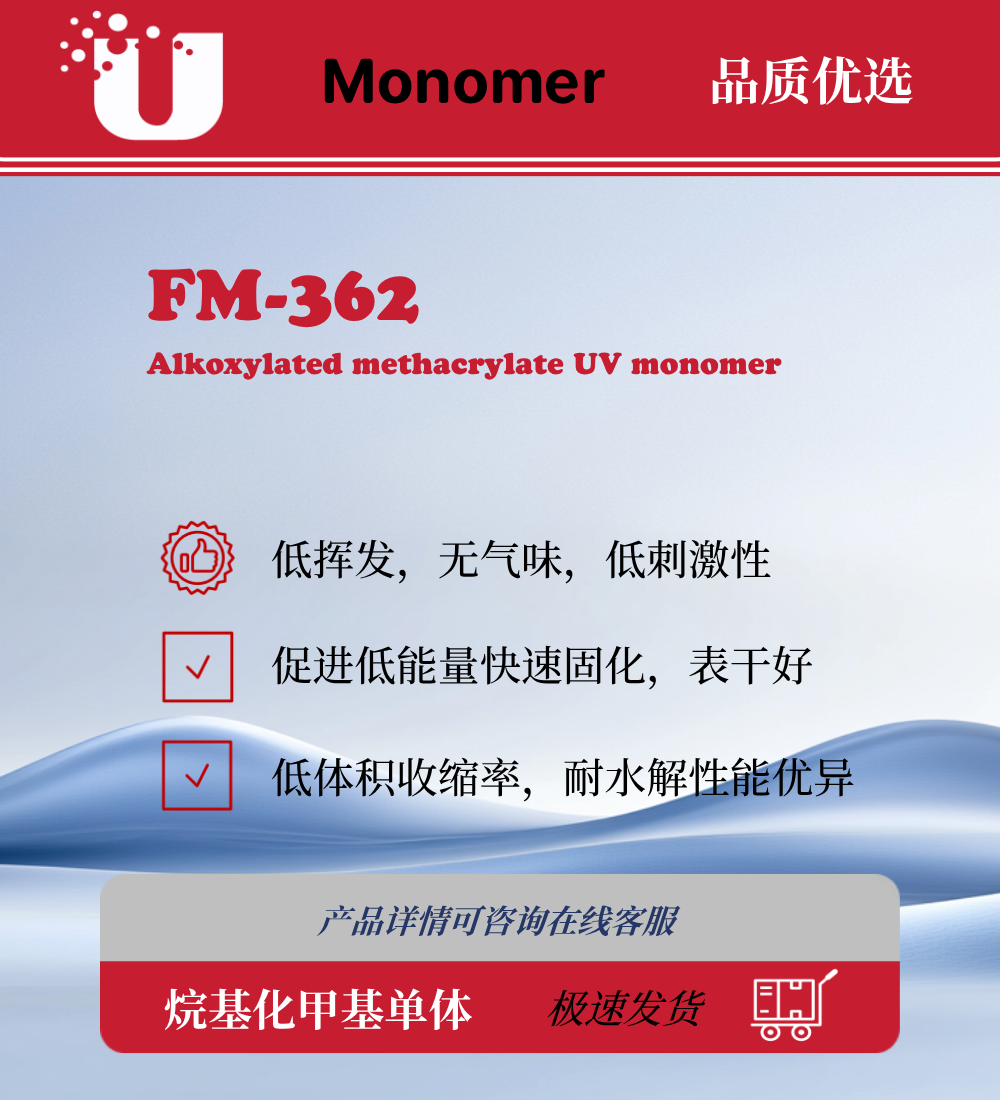 FM-362 是单官能度甲氧基丙烯酸酯UV单体,低挥发、无气味,低刺激性。促进低能量快速固化、表干好,成膜强韧。低的体积收缩率,耐水解性能优异.