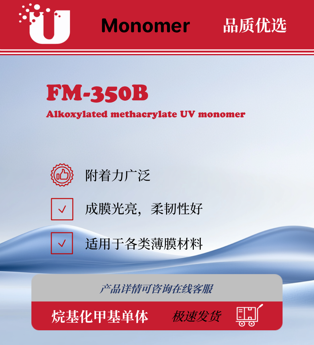 FM-350B是单官能度甲氧基丙烯酸酯UV单体,附着力广泛,成膜光亮,柔韧性好。对各类薄膜材料更加适合,极低的体积收缩率,耐水解性能。