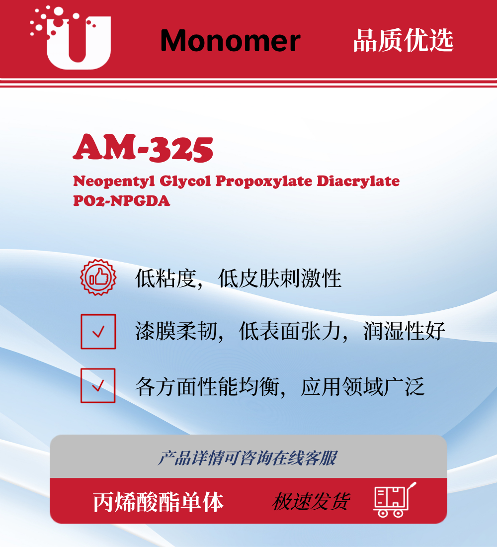 AM-325丙烯酸酯单体低粘度,低皮肤刺激性。漆膜柔韧,低表面张力,润湿性好。各方面性能均衡。作为涂料,油墨,等较为常用的产品。