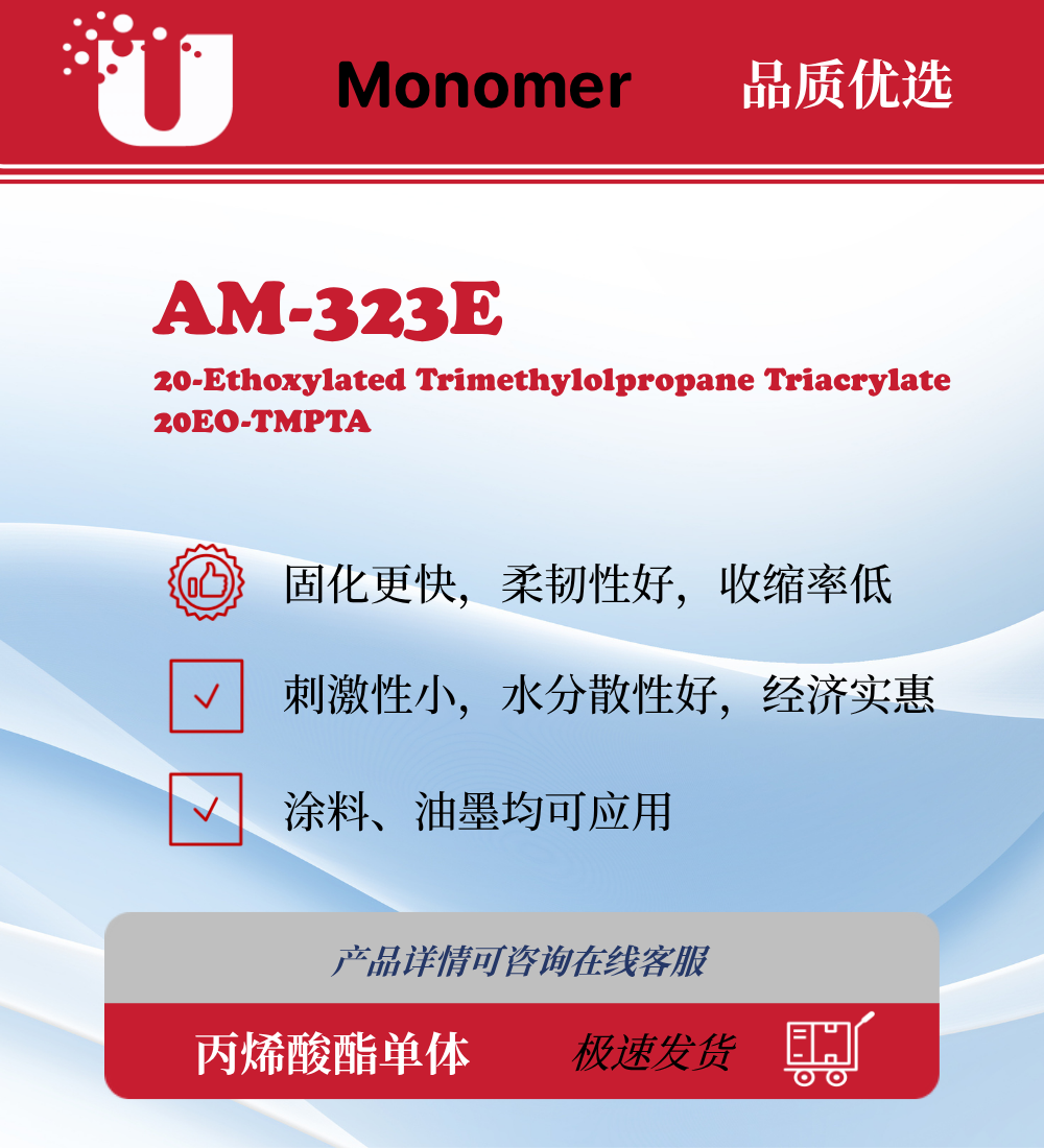 AM323E 比 AM-323 丙烯酸酯单体固化速度更快,柔韧性好,收缩率低,皮肤刺激性小,水分散性好,经济实惠。可用作涂料、油墨等更常用的产品。