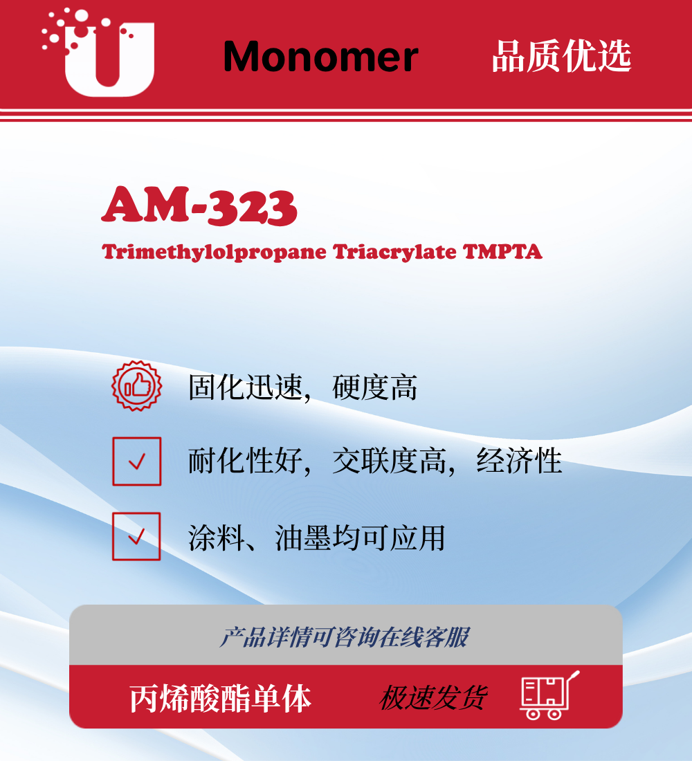 AM-323丙烯酸酯单体固化迅速,硬度高,耐化学品性优良,成膜交联度高,经济性好。作为涂料,油墨,等较为常用的产品。