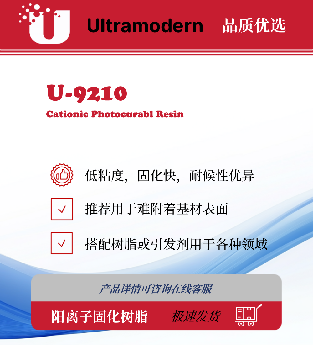 U-9210 树脂属于阳离子与自由基杂化体系 UV 树脂,低粘度固化速度比 9310 更快。同样拥有阳离子固化体系低收缩,高附着性等特点。户外耐候性优异,推荐用于玻璃、陶瓷、金属等较难附着的有机和无机材料表面。同时保持高硬度与柔韧性,耐水及耐化学品侵蚀性优异。接枝丙烯酸酯改善固化及施工性能,适应于各种工艺。在 400-600mj 能量下能够充分固化。与硫鎓盐及碘鎓盐阳离子光引发剂混合后应用于 UV涂料,油墨,要求极低收缩及高折光率的特殊胶黏剂,薄膜印刷,光纤涂层等领域有很好的效果。