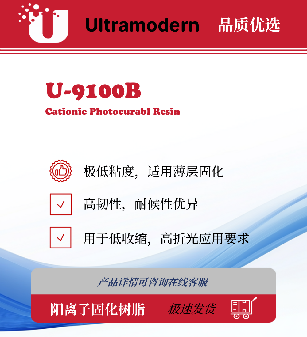 U-9100B 树脂属于阳离子与自由基杂化体系 UV 树脂,极低粘度,固化速度比 9210 更快,特别适合用于小于 5um 以下涂层固化。高柔韧性,户外耐候性优异,极低成膜厚度条件下能提供优异的耐水及耐化学品侵蚀性。在 400-600mj 能量下能够充分固化。与硫鎓盐及碘鎓盐阳离子光引发剂混合后应用于薄膜印刷涂料,油墨,要求极低收缩及高折光率的特殊胶黏剂,3D 打印成型等领域有很好的效果。