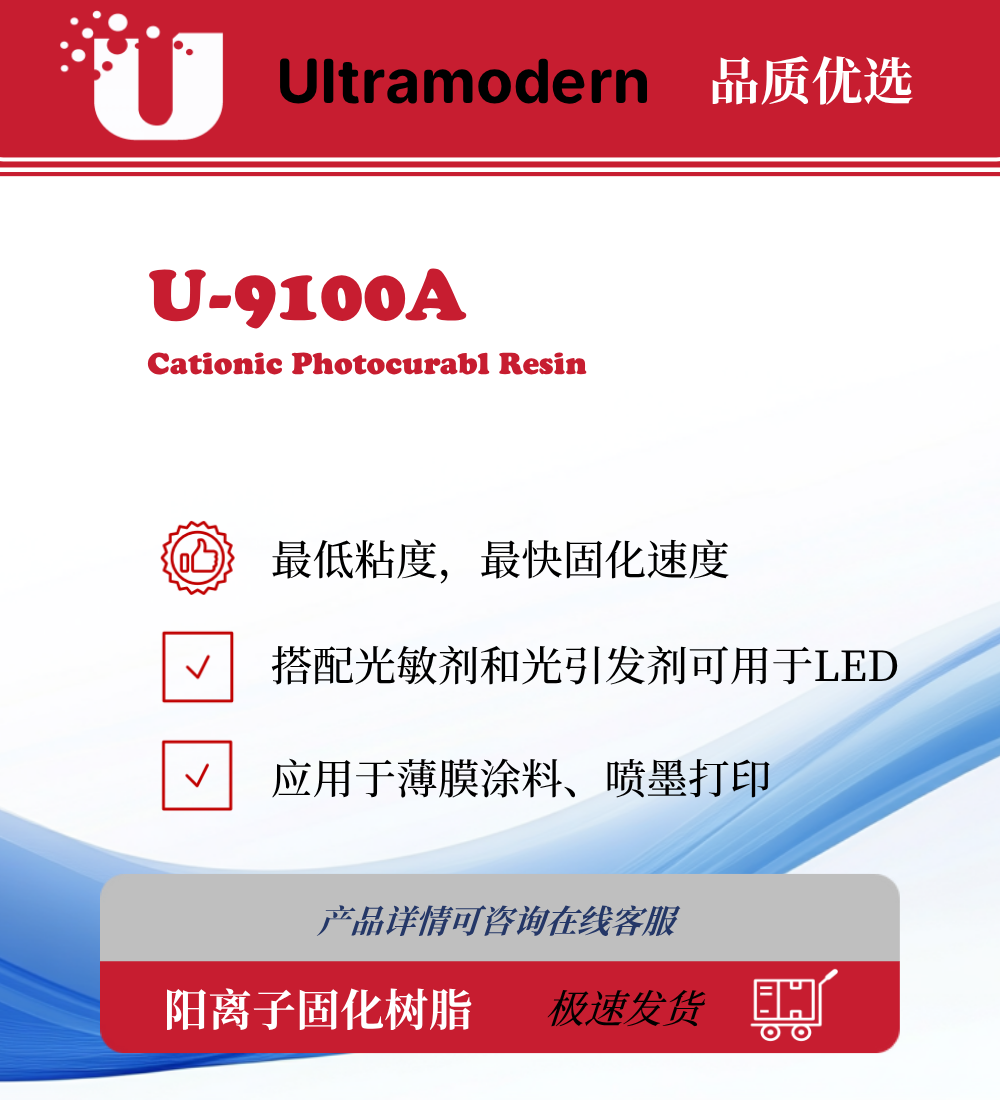 U-9100A树脂属于阳离子与自由基杂化体系 UV 树脂,最低粘度,最快的固化速度,在 300-400mj 能量下能够充分固化。搭配适合的光敏剂和引发剂可应用于 LED 长波光源固化,应用于薄膜印刷涂料,油墨,UV 喷墨打印,3D 打印成型等领域有很好的效果。