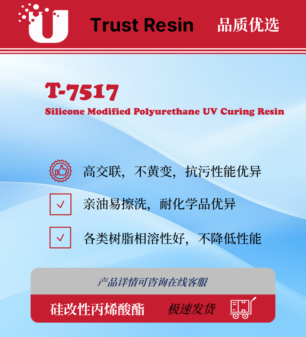 T-7517 树脂是硅改性聚氨酯丙烯酸酯 UV 树脂,具有高交联硬度,不黄变。对 PC、ABS 等塑料附着力好,持久的防污能力。亲油性、易擦洗,耐化学品性能优异。可与各类树脂与单体很好的相溶,而不明显降低耐污能力。