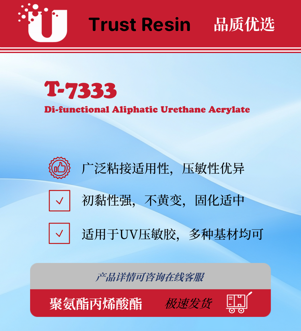 T-7333 树脂是一款非常特殊的聚氨酯丙烯酸酯树脂,具有广泛的粘接适用性。初黏力强,不黄变,固化适中。拥有较好的耐温性及耐水解性。推荐 UV 压敏胶领域应用可提供很好的初粘效果和内聚力。收缩率极低,粘接薄膜材料时不会造成变形卷曲。成膜水白无色,透光性好。优异的压敏性,反复使用也不会降低粘接黏性。对金属、玻璃、氧化金属镀层甚至与各种低极性塑料薄膜的粘接同样有效。