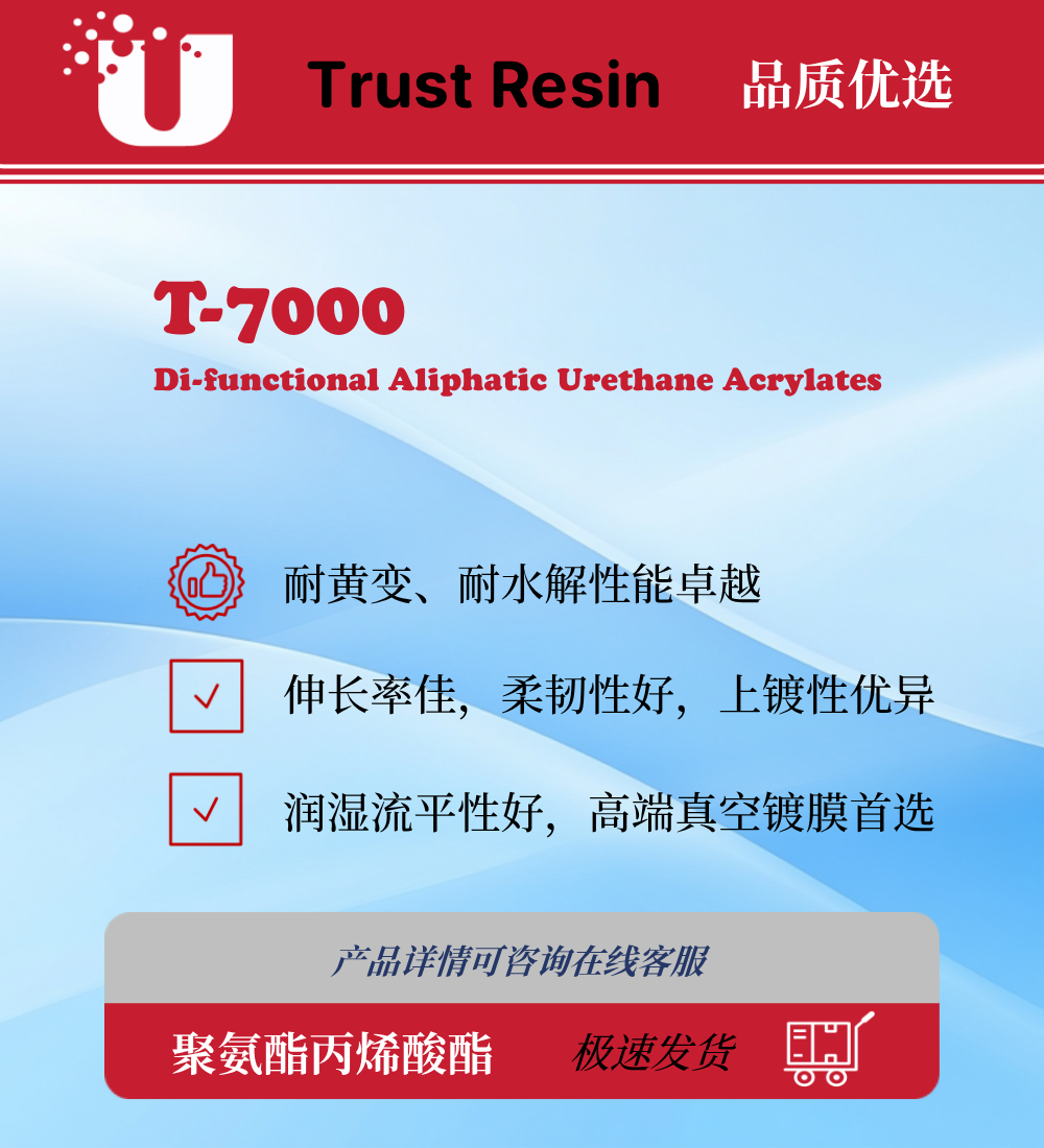 T-7000树脂以其卓越的耐黄变与耐水解特性,确保了制品在长期使用或恶劣环境下仍能保持清澈透明与性能稳定。其分子结构赋予产品极佳的伸长率,柔韧性出色。同时,该树脂拥有行业顶尖的上镀性能,与金属镀层结合力强,光泽度高;其优异的润湿流平性使得成膜表面更为平整均匀,有效杜绝缩孔等缺陷,是高端真空镀领域的理想选择。