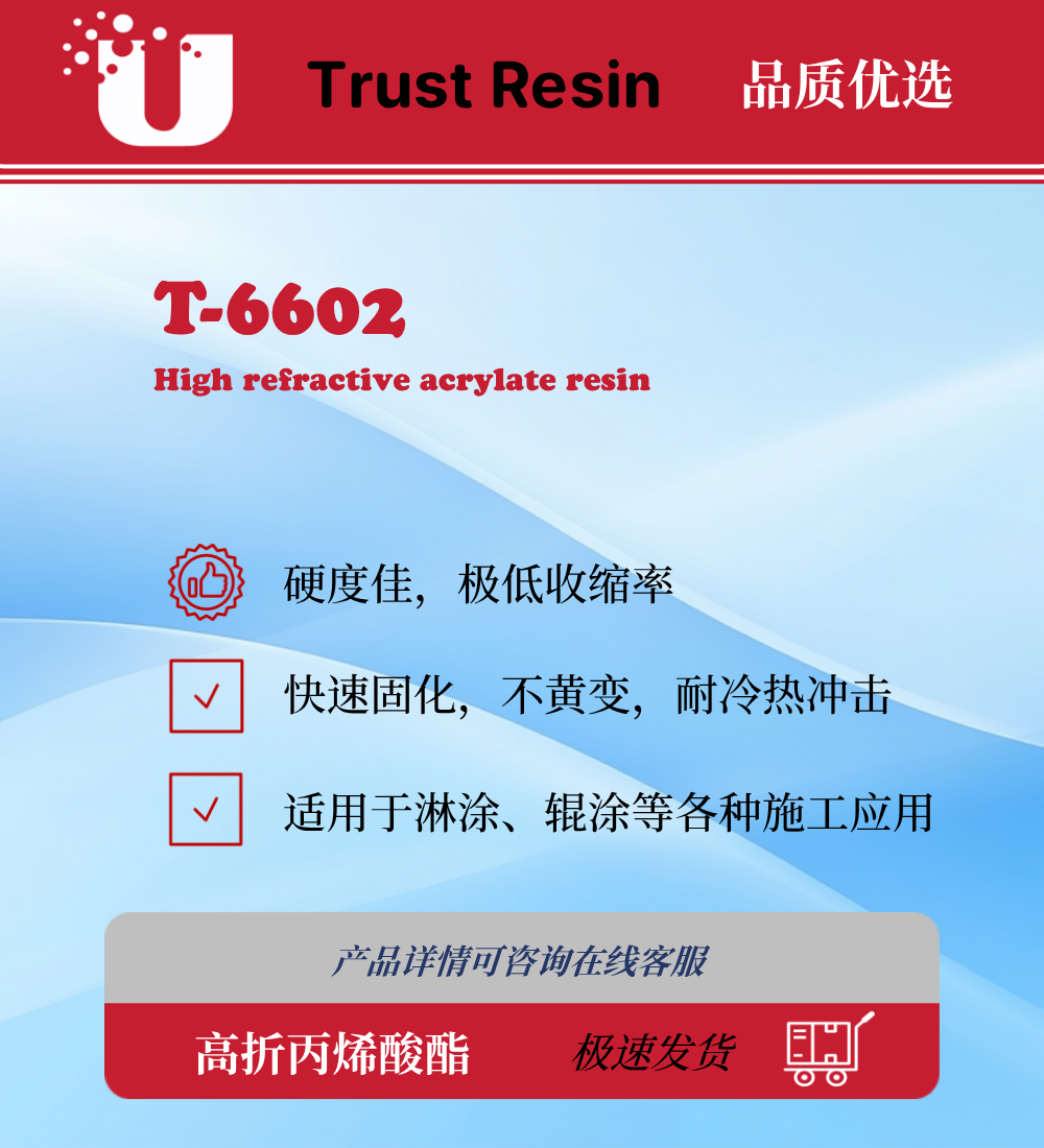 T-6602 树脂是一款高折光率的改性丙烯酸酯 UV 树脂,硬度佳、极低收缩率快速固化、不黄变,耐冷热冲击。做主体树脂应用于光学镜头粘接、光学薄膜印刷、光纤涂层等。高硬度,耐高温高湿。适用于淋涂,涂或丝网印刷等各种施工应用。