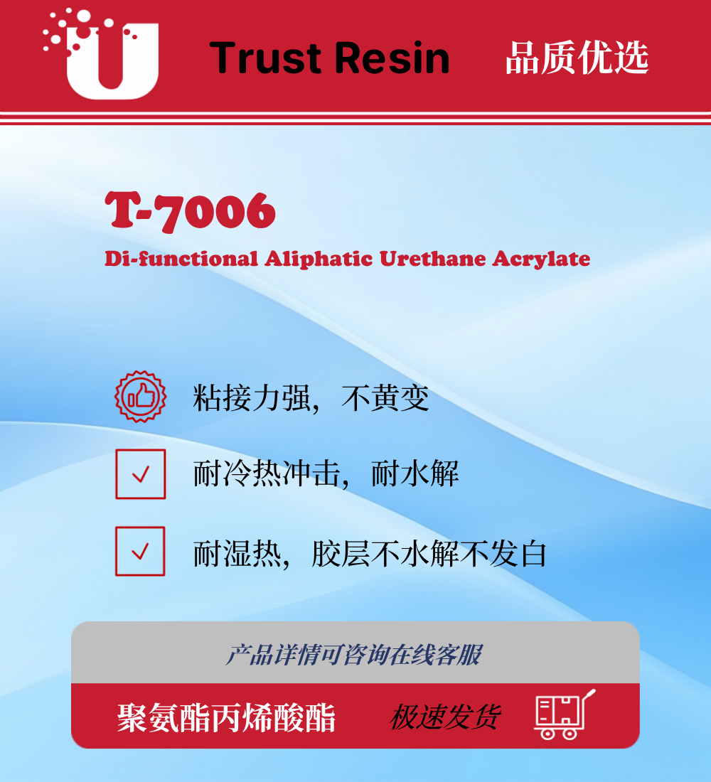 T-7006树脂是一款两官能度聚氨酯改性丙烯酸酯UV树脂,粘接能力强,不黄变,耐冷热冲击,耐水解性能好。做主体树脂应用于塑料片材,各类薄膜材料以及金属材料的涂敷粘接,在覆膜无氧条件固化时能保持优异的粘接能力与弹性。固化涂层在持续高温条件下也能保持稳定的附着能力。耐湿热,胶层不水解不会发白。