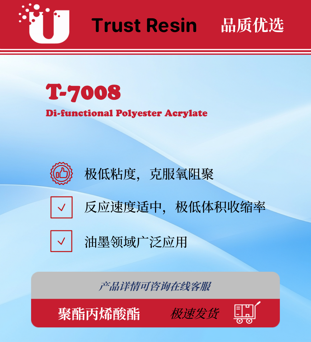 T-7008树脂具有极高的弹性,非常低的粘度、能克服氧阻聚,具有较快的反应速度。确保持了非常低的体积收缩率。 在 UV 无溶剂喷涂,辊涂、UV 喷墨打印,特种印刷油墨等领域都有广泛应用。