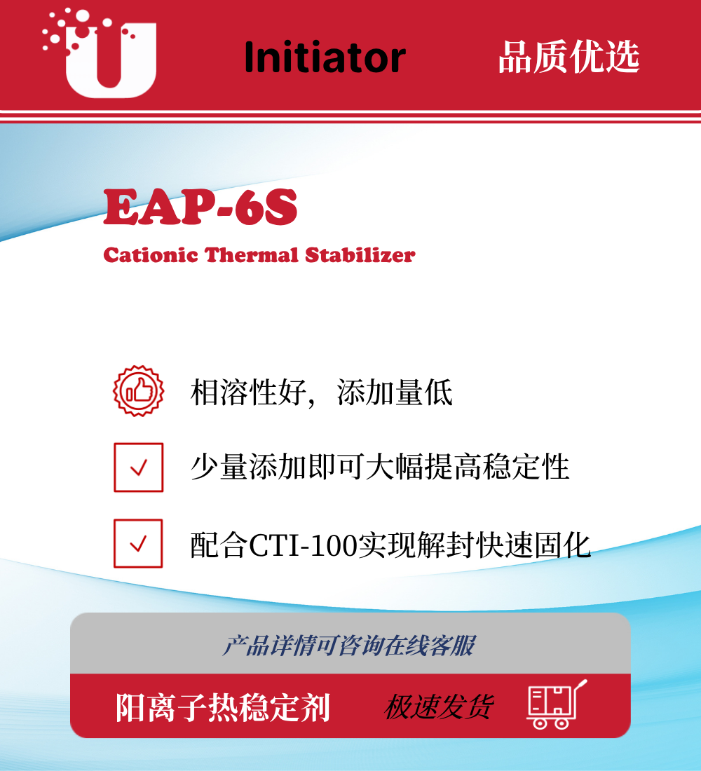 EAP-6S 是一款优秀的热封闭剂,相溶性好,添加量低。针对阳离子热引发的常温储存问题予以持久的稳定性。在未添加热封闭剂的情况下胶粘剂只能常温存放 2-7 天(根据主体树脂的活性差异)粘 度即会大幅上升甚至凝胶固化,通常需要全程冷链储存和运输。在通过添加 EAP-6S 热封闭剂后常温不大于40℃的情况下可以稳定储存3-6个月,而粘度只上升<10%。配合 CTI-100 阳离子热引发剂使用,解封温度由原来的 80℃提高到 90℃即可快速反应固化,并不影响成膜物的物理及化学性能。