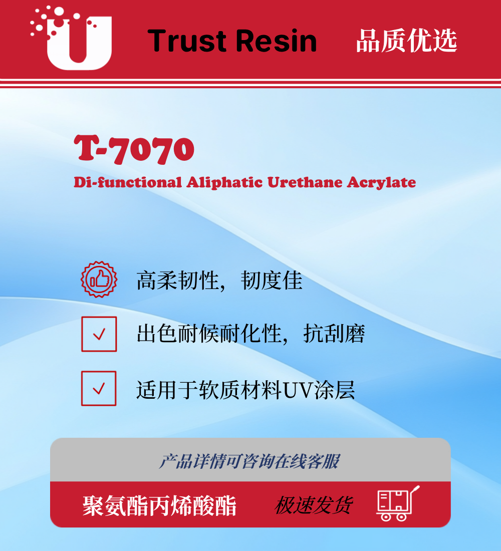 T-7070树脂是一款两官能度聚氨酯改性丙烯酸酯UV树脂,具有高柔韧性同时兼具极佳的硬度、优异的耐氧化性、耐碘酒性能,以及出色的抗刮耐磨性。该树脂适用于软质材料UV涂层、薄膜UV应用和柔性涂料,提供优异的保护性能和耐久性。
