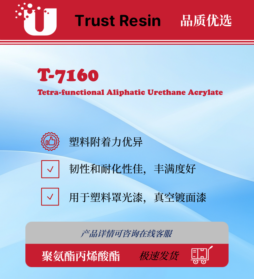 T-7160树脂是一款四官能度聚氨酯改性丙烯酸酯UV树脂,具有优异的各类塑料附着力,韧性与耐化性佳,丰满度好,底材润湿性好。作为主体树脂广泛应用于塑料罩光涂料、真空镀面漆、涂料和油墨等领域。