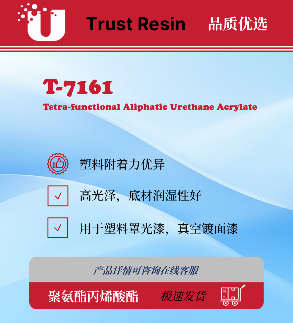 T-7161树脂是一款四官能度聚氨酯改性丙烯酸酯UV树脂,具有优异的各类塑料附着力,高光泽,底材润湿性好,强韧性及耐化性。推荐应用于塑料罩光涂料,真空镀面漆,涂料、油墨等领域。