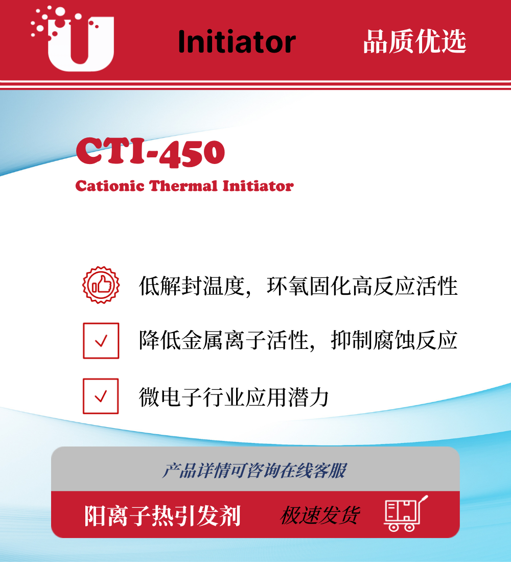 CTI-450 为一款封闭型二苯基硫鎓四(五氟苯基)硼酸盐类阳离子引发剂,具有较低的解封温度,对环氧化合物的固化反应表现出高活性。该产品广泛应用于电子封装、精密电路印刷成型等领域。其硼酸根离子可与金属离子形成稳定络合物,有效降低金属离子活性,从而抑制腐蚀反应的发生。这一对金属基材的良好兼容性,使其在微电子行业中具有重要的应用价值。