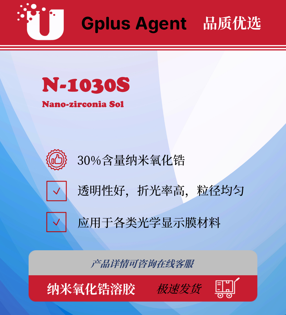 N-1030S 锆溶液是 30%含量的纳米级氧化锆的分散溶液, 具有透明性好,折光率高、粒径分布均匀。应用于各类光学 显示膜材料,纳米涂层添加剂。