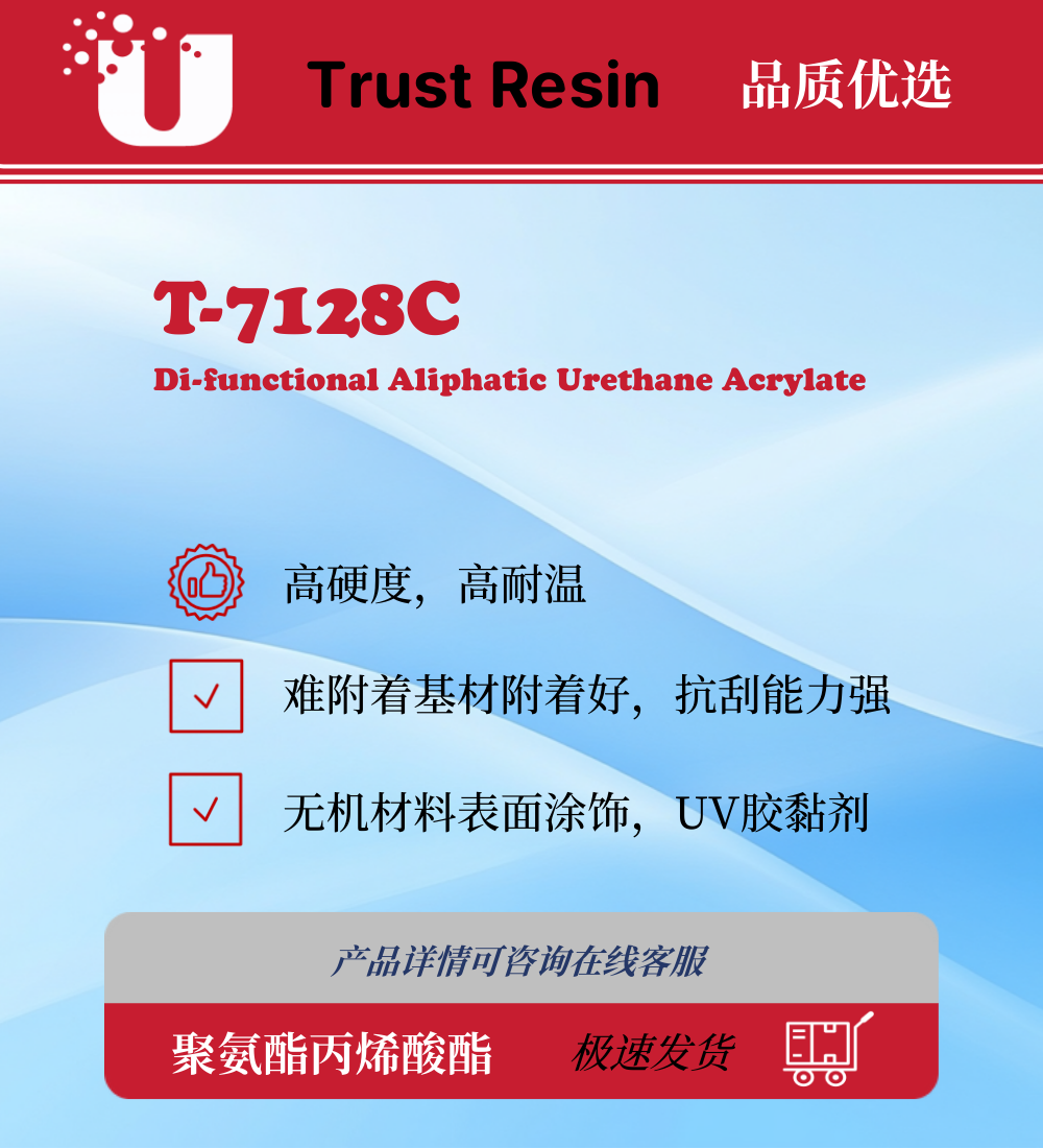 T-7128C 树脂是比 T-7128 具有更高硬度及耐温性的产品,在 230℃条件下2 小时不黄变,不失光同样适用于玻璃、陶瓷、金属等较难附着的有机和无机材料表面,无需做前处理。不但有优异的百格附着力,而且抗刮能力强。耐常温水及沸水性能好,收缩率极低。非常高的双键转换率,在真空蒸镀或水煮后仍能保持优异的韧性及附着力。不需添加任何助剂可直接应用于玻璃、陶瓷、各类金属等表面装饰涂料,真空镀膜和油墨及胶黏剂领域。