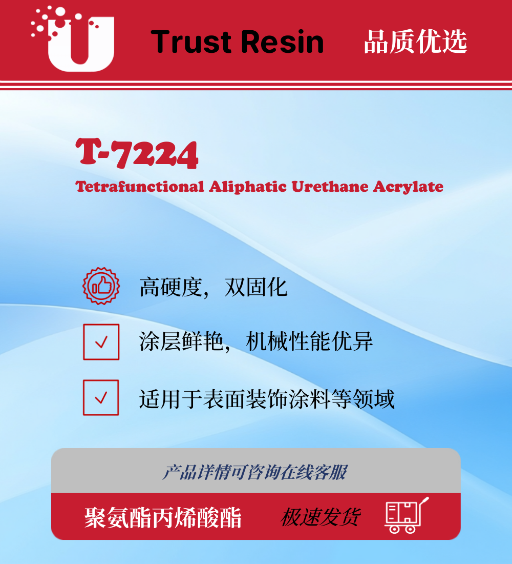 T-7224 是一款双固化UV树脂,含羟基可参与后固化交联反应,ABS塑料基材表面硬度可达3H,玻璃基材大于7H。高光泽涂层鲜艳性好,耐化学品及高温高湿等严苛测试能力。做主体树脂应用于汽车内饰等异形件涂装,户外耐候性优异。应用于各类材料表面装饰涂料,油墨及胶黏剂领域。