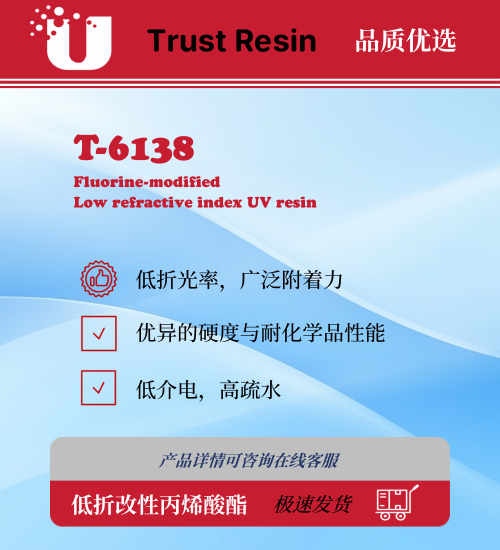 T-6138 树脂是一款氟改性丙烯酸酯 UV 树脂,具有低折射率、广泛的附着适应性。高硬度,在低于 1um 及纳米级涂层厚度时表现出优异的硬度及耐摩擦性能。玻璃表面硬度>4H(三菱铅笔),PET 表面>3H 硬度。施工适应性好,耐化学品优异,低介电指数、高疏水性。