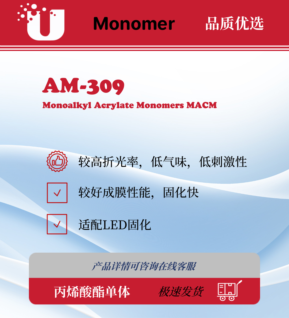 AM-309 丙烯酸酯单体具有较高的折光率(1.516),低气 味,低皮肤刺激性。拥有较好的成膜性能;固化速度快接近 三官单体,可以适应 LED 光源快速固化。玻璃化温度高,各 方面性能均衡。作为油墨,胶粘剂等较为常用的产品。