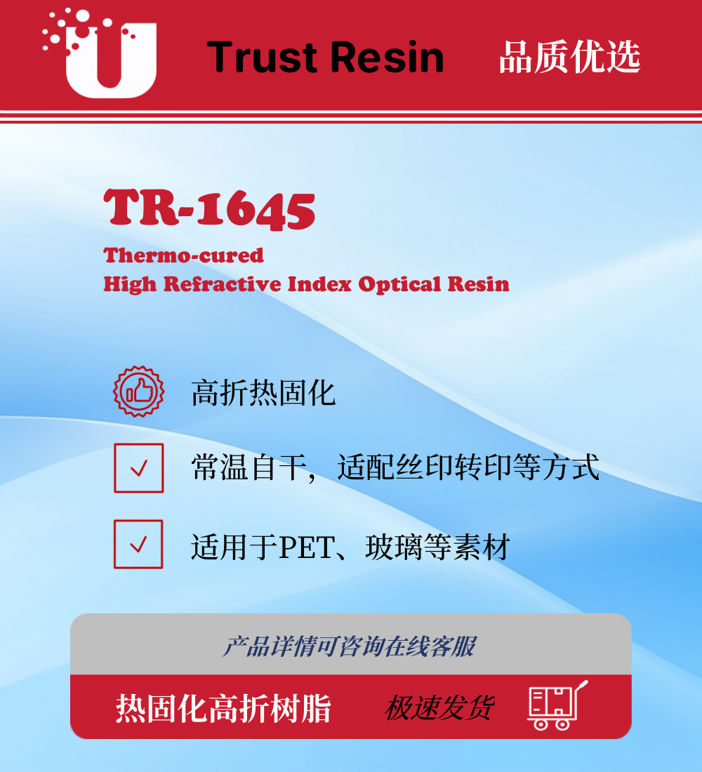 TR-1645 是一款高折射率热固化光学树脂,具有最佳的光学特性。应用于 PET、亚克力、玻璃等素材表面形成优异的光学效应。耐酸碱及耐化学品性能高,适用于平面、圆形、 异形件等丝印、转印、淋涂,辊涂,旋涂等施工方式。搭配适合的固化剂可以常温自干,高温烘烤,以单组份或双组分储存, 施工灵活应用广泛。