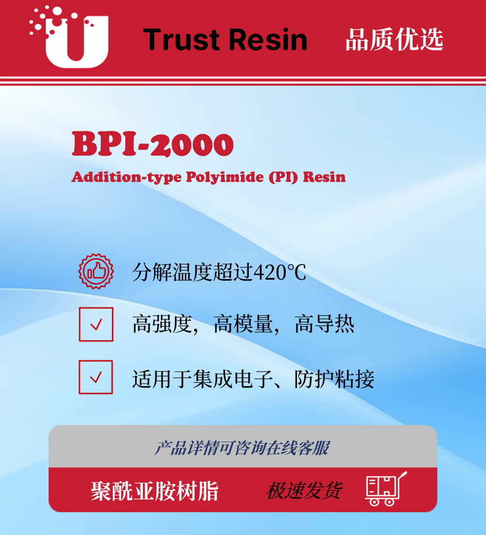 BPI-2000 是加聚型聚酰亚胺(PI)树脂,其分子结构中引入高活性的 C=C 双键,因受相邻两个强吸电子羰基的影响而高度缺电子,在加热或催化剂作用下可发生交联固化, 形成具有高交联密度和刚性环状结构(苯环、酰亚胺环)的高分子材料。这一独特的结构赋予其卓越的综合性能:其分解温度超过 420℃,长期使用温度范围达 177-232℃,兼具高强度、高模量、低热膨胀系数、高导热性、优异的耐湿热、 耐辐射、阻燃以及耐各类溶剂和酸碱的特性。