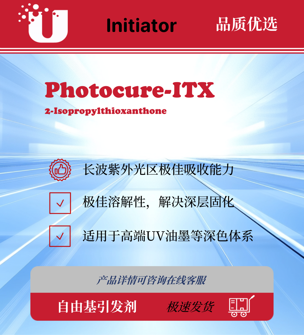 ITX 具有极佳的溶解性能,能迅速溶于各类活性稀释剂中。在实际应用中,它常作为光敏剂与引发剂 907 或 369 配合使用,通过能量转移机制显著提升固化效率,有效解决深层固化不彻底的问题。由于其优异的光敏特性,ITX 是高端UV油墨、防焊油墨及各种深色涂层体系中不可或缺的核心组分。