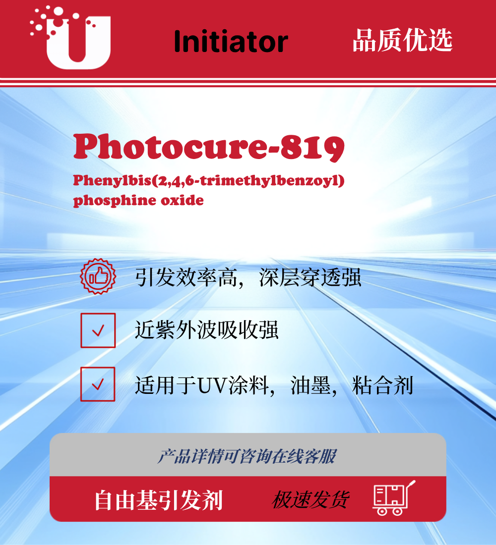 它同样具备优异的“光漂白”特性,固化后体系泛黄率极低。因其卓越的深层穿透力,819 特别专精于高遮盖力体系(如深色颜料、高钛白粉配方)及超厚涂层的固化。819 完美适配长波 UV-LED 光源,工业应用中常与 184、1173 等表面光引发剂复配,以实现表干与深透的完美平衡。
