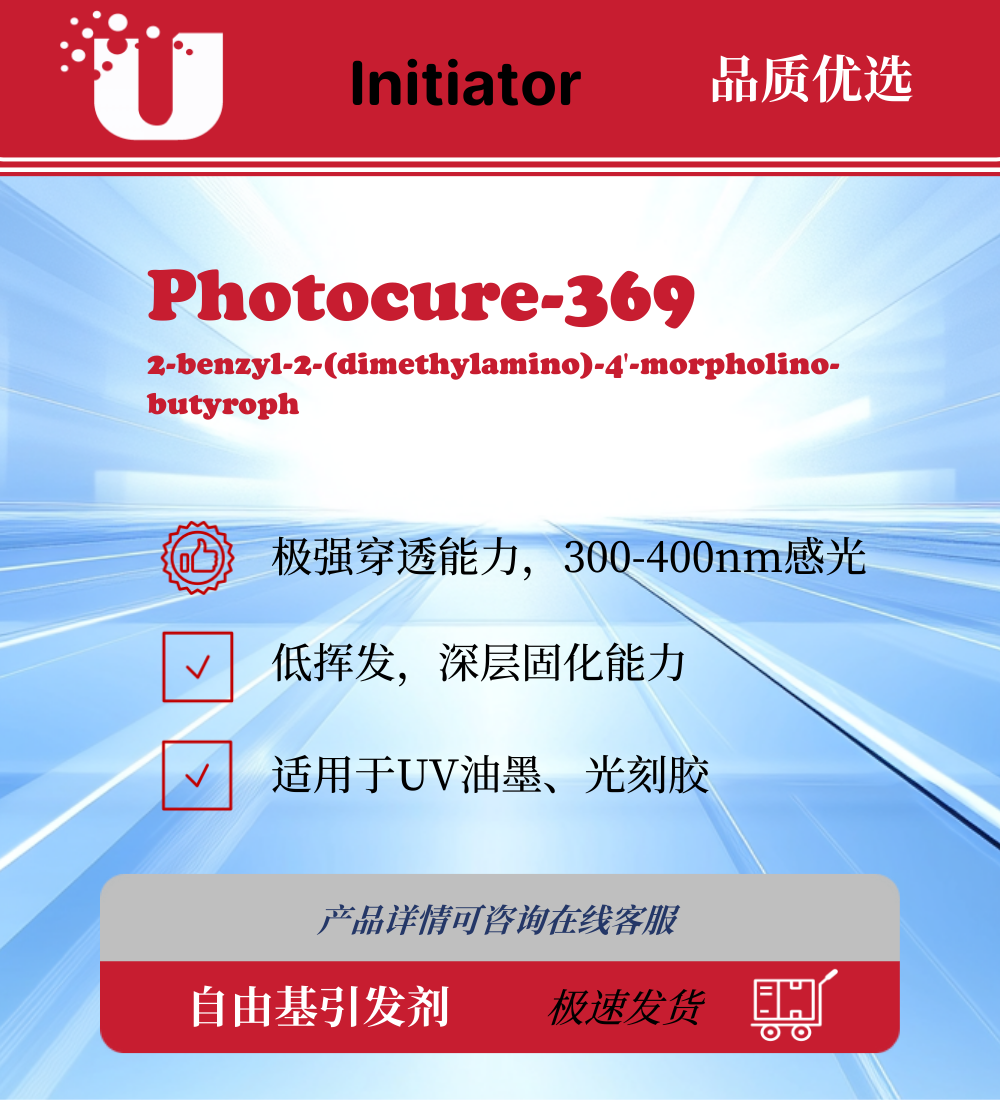 光引发剂 369 是一种高效的α-氨基酮类自由基(I型)光引发剂,专为高科技及高附加值的UV固化应用设计。其分子结构使其对紫外光谱中的长波段(300-400nm)具有极高的感光度,这意味着它具有极强的穿透能力。该产品特别适用于含有颜料的UV体系以及光敏性要求极高的电子材料领域。与传统的引发剂相比,369 在深色油墨和厚涂层中表现出卓越的深层固化性能,且挥发性低,是高端UV油墨及光刻胶配方的核心组分。