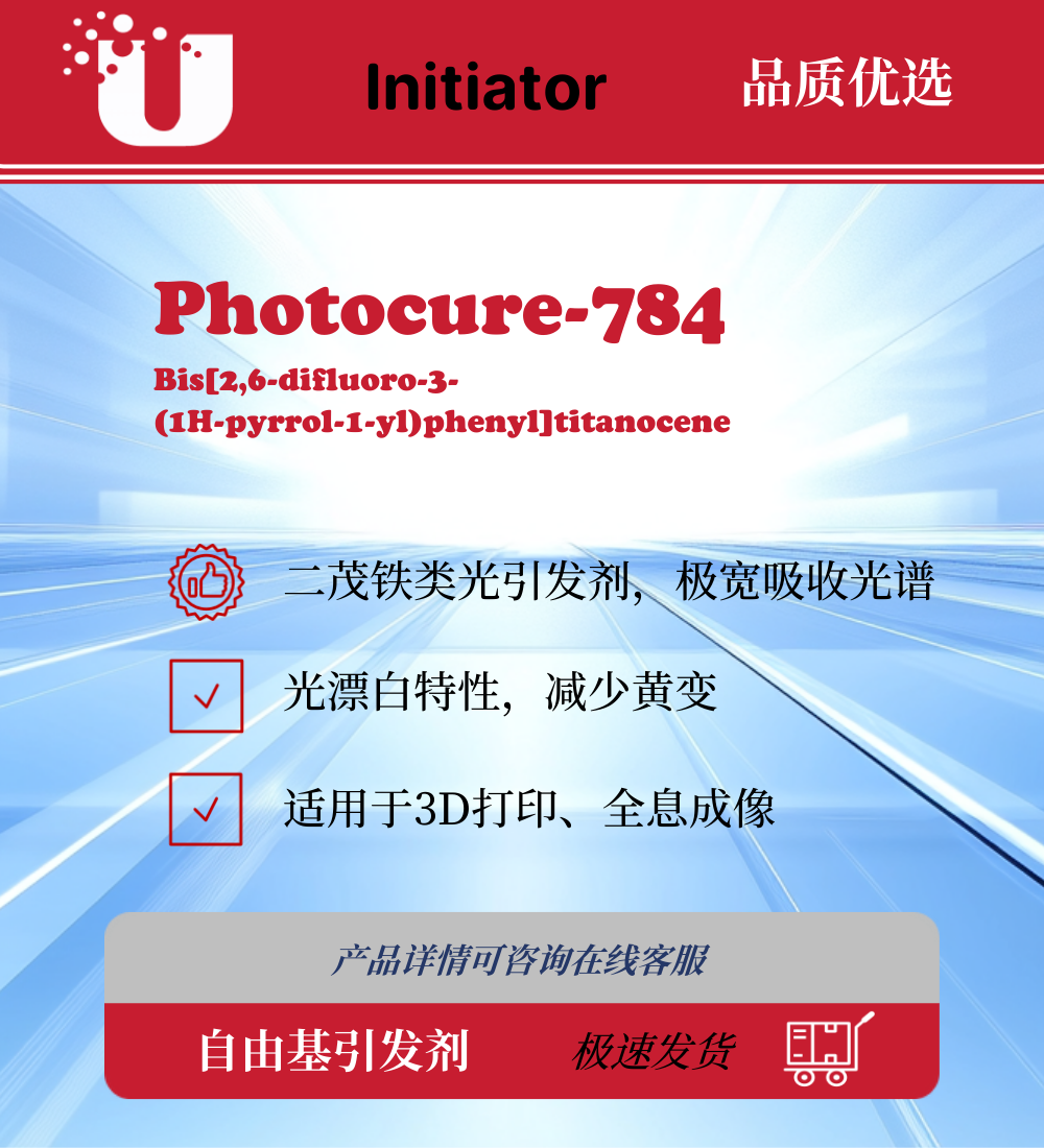 光引发剂 784 是一种高活性的二茂钛类可见光引发剂,专为尖端的光固化技术设计。其独特的分子结构赋予其极宽的吸收光谱,不仅在紫外区,在可见光区(最长可达500nm)亦有强烈的吸收。该产品最显著的特点是具备优异的“光漂白”特性(固化后颜色消退),特别适用于要求高透明度、深层彻底固化及对可见光光源敏感的体系。它是3D打印、全息成像及高端光学树脂配方中不可或缺的核心组分。