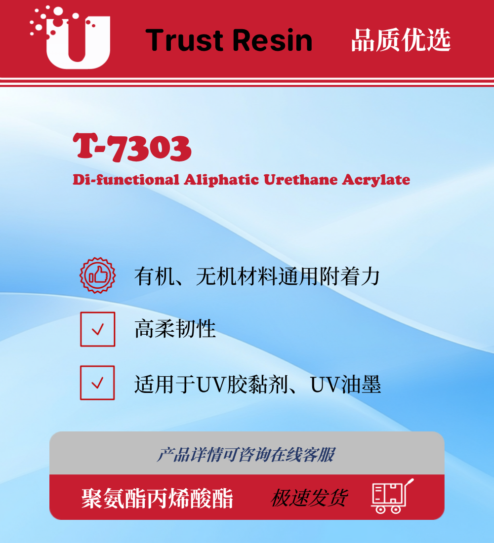 T-7303 是一种两官能团的聚氨酯丙烯酸酯,具有低玻璃化温度、粘度适中、高柔韧性、高伸长率以及对有机和无机材料通用附着力极强的特点,可作为光固化体系的主体或改性树脂使用,广泛推荐应用于 UV 胶粘剂和 UV 印刷油墨等领域。