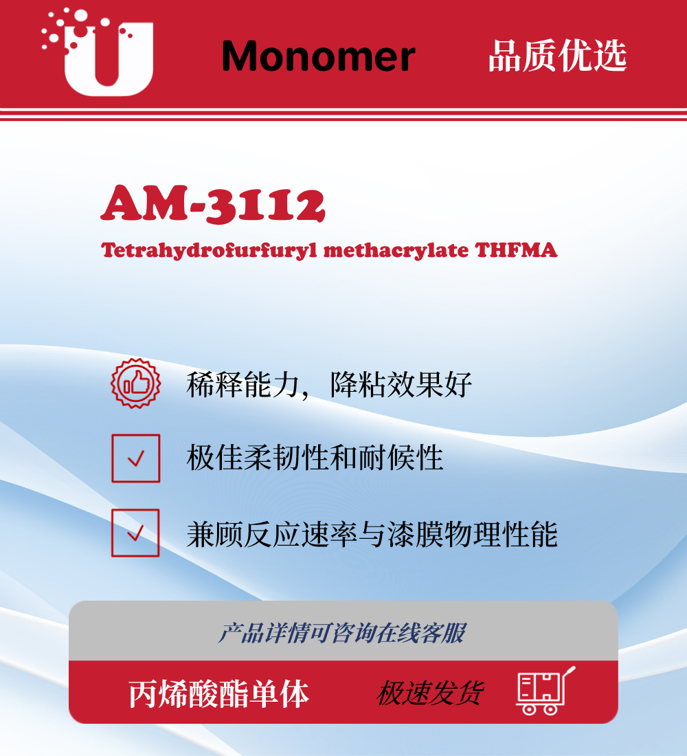 AM-3112 THFMA 甲基丙烯酸四氢糠酯是一种带有独特环醚结构的单官能团甲基丙烯酸酯类单体。凭借其特殊的分子构型,该产品在辐射固化体系中不仅展现出优异的稀释与降粘能力,更能有效降低配方固化过程中的体积收缩率。